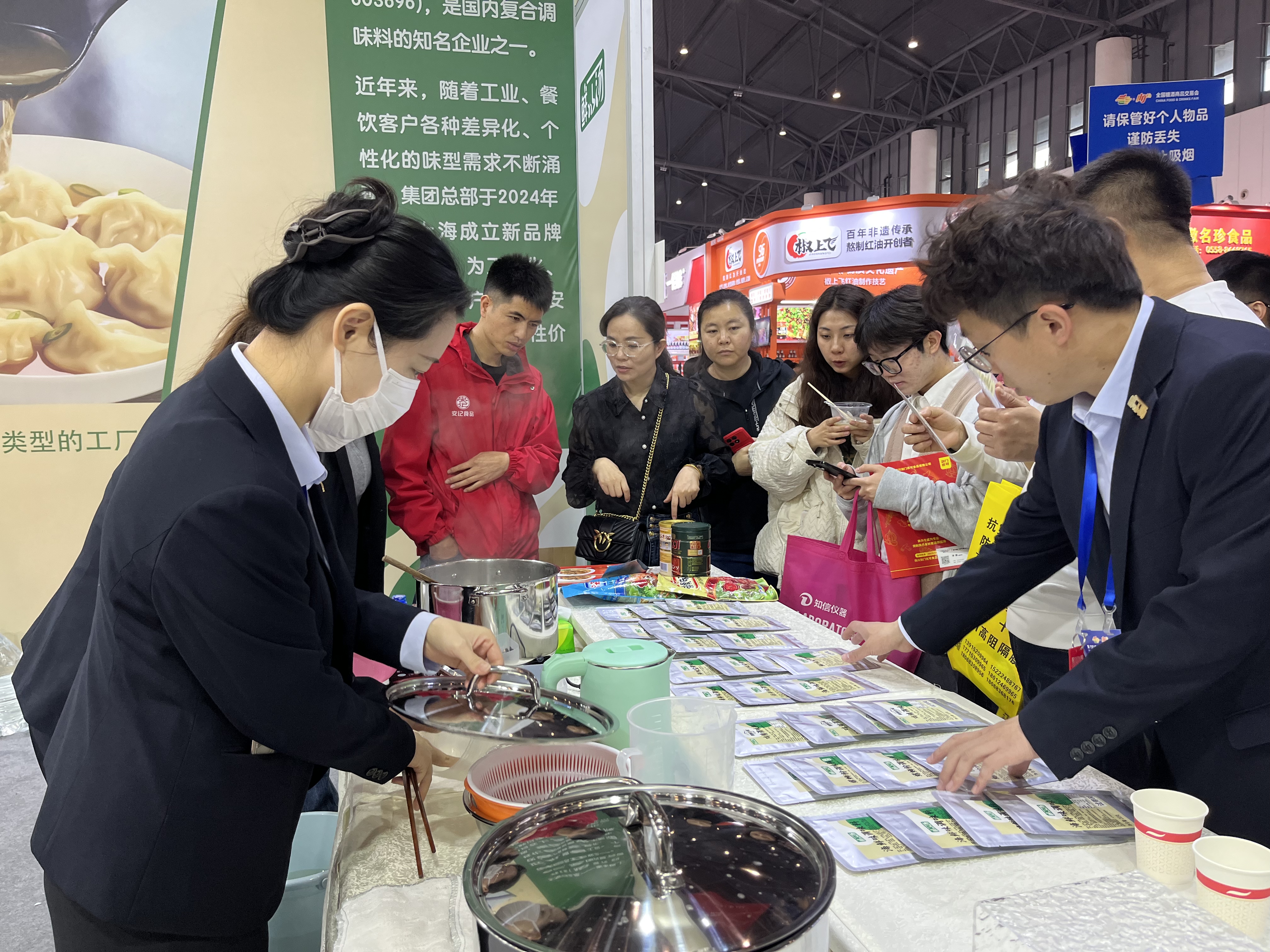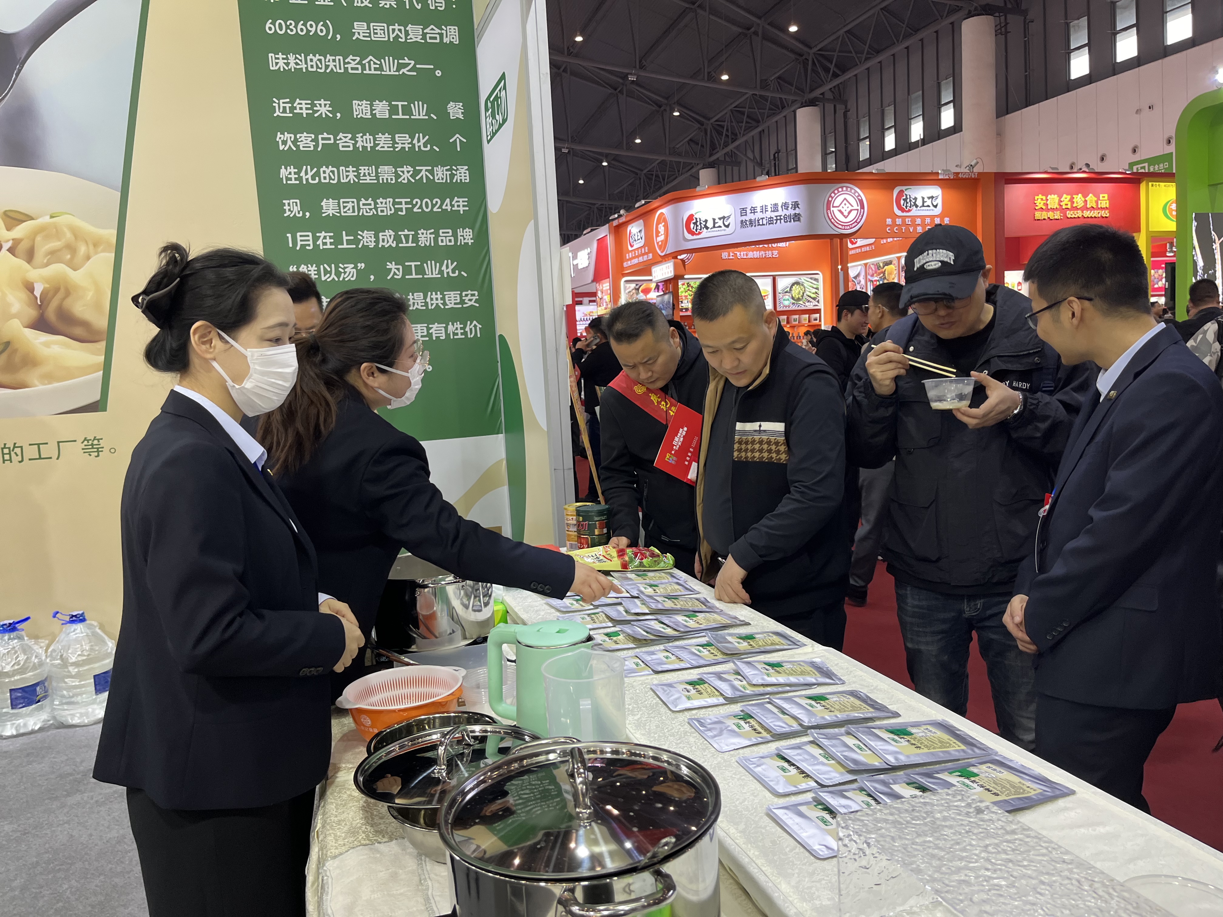 展會開始,安記生物團隊成員以最佳的精神風貌迎接觀展客戶。試吃組井然有序地派發試吃品螺螄粉,讓觀展商以最直接的形式了解我們的產品、風味;客戶招待組則負責介紹產品,溝通客戶需求,讓更多伙伴了解“鮮以湯“品牌,與意向客戶建立友好關系。